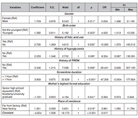 Background. Autism spectrum disorder (ASD) is a complex neurodevelopmental condition influenced by both genetic and environmental factors, with epigenetic mechanisms playing a central role in gene regulation. Early identification of risk factors is essential for timely intervention, particularly in children aged 1–3 years when diagnosis remains challenging. Materials and methods. This case-control study aimed to identify prenatal, perinatal, and postnatal factors associated with the incidence of ASD in young children. A total of 156 participants (79 with ASD and 77 controls) aged 1–3 years were enrolled from Dr. Soetomo General Hospital. Data were collected from medical records and structured parental interviews, covering variables such as maternal health, birth history, family background, socioeconomic status, and environmental exposures. Results. Statistical analysis using bivariate and multivariate logistic regression identified several significant risk factors. These included male gender (odds ratio (OR): 5.634, p = 0.011), being the youngest child (OR: 4.022, p = 0.023), lack of maternal folic acid supplementation during pregnancy (OR: 15.265, p = 0.032), history of premature rupture of membranes (OR: 28.401, p = 0.006), and screen time exceeding one hour per day (OR: 47.356, p < 0.001). Additionally, lower maternal education level and residence near industrial areas were associated with increased ASD risk. Conclusions. These findings highlight the multifactorial etiology of ASD and the importance of modifiable prenatal and postnatal factors. Promoting maternal education, prenatal care, folic acid supplementation, and reducing early screen exposure could help in ASD prevention strategies. Further research is needed to explore underlying mechanisms and validate these associations in larger populations.