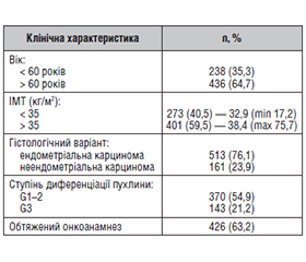 Актуальність. Рак ендометрія (РЕ) є одним з найпоширеніших злоякісних новоутворень жіночої репродуктивної системи. За рекомендаціями ESGO/ESTRO/ESP Society, саме метаболічні та ендокринні фактори визнаються ключовими модифікованими факторами ризику розвитку РЕ. Мета: оцінити частоту та типи патології ендокринної системи у хворих на рак ендометрія. Матеріали та методи. Проведено проспективне дослідження 674 пацієнток з РЕ І–ІV стадій, які отримали лікування у Прикарпатському клінічному онкологічному центрі Івано-Франківської обласної ради з 2021 по 2024 рік. Вік пацієнток від 28 до 83 років, у середньому 62,4 ± 2,3 року. Результати. Серед пацієнток більшість (436; 64,7 %) становили жінки віком понад 60 років. У 401 (59,5 %) пацієнтки індекс маси тіла перевищував 35 кг/м2 та становив у середньому 38,4 кг/м2. Однією із основних причин виникнення РЕ є підвищення індексу маси тіла. Переважали хворі із надлишковою масою тіла, ожиріння І ступеня — 244 (36,2 %) пацієнтки. Патологія щитоподібної залози (ЩЗ) діагностована у 253 (37,5 %) пацієнток. Серед захворювань ЩЗ найчастіше траплялися вузловий зоб та автоімунний тиреоїдит — 146 (21,7 %) та 71 (10,5 %) випадок відповідно. Частота цукрового діабету (ЦД) серед обстежених становила 37,8 %, що відповідає 255 випадкам. У пацієнток з РЕ переважав ЦД 2-го типу, який діагностовано у 247 (36,6 %) випадках. У пацієнток з РЕ та супутньою ендокринною патологією виникають ускладнення у післяопераційному періоді. Найчастішим ускладненням було загоювання післяопераційної рани вторинним натягом у пацієнтів з тяжкими формами ЦД у стані субкомпенсації/декомпенсації та у поєднанні із ожирінням. Висновки. Частота ендокринної патології у пацієнток з РЕ становила 67,4 %. Ожиріння є найчастішою ендокринною патологією серед пацієнток з РЕ, воно виявлено у 418 (62,0 %) осіб. З однаковою частотою було діагностовано у пацієнток РЕ цукровий діабет та захворювання ЩЗ, 255 (37,8 %) та 253 (37,5 %) відповідно. У 36 (5,4 %) жінок з РЕ в анамнезі був синдром полікістозних яєчників. У пацієн­ток з РЕ відзначалася комбінована патологія (ожиріння + цукровий діабет; захворювання щитоподібної залози + синдром полікістозних яєчників). У пацієнток з РЕ та супутньою ендокринологічною патологією часто виникають ускладнення у післяопераційному періоді.