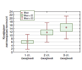 Актуальність. Гастроезофагеальна рефлюксна хвороба (ГЕРХ) та ожиріння залишаються найбільш поширеною коморбідною патологією, яка суттєво впливає на погіршення якості життя пацієнтів. Багато досліджень проведено для визначення факторів, що сприяють розвитку цих захворювань, проте найбільш дискутабельним залишається питання ролі лептину. На сьогодні немає чітких критеріїв для ефективної оцінки чутливості до лептину в клінічних умовах, хоча окремі дослідники вважають гіперлептинемію ключовим маркером лептинорезистентності. Мета: обґрунтувати підходи до оцінки та профілактики лептинорезистентності у пацієнтів із ГЕРХ та ожирінням. Матеріали та методи. Обстежено 60 чоловіків, хворих на ГЕРХ та ожиріння, які були розподілені на три групи залежно від рівня лептину. Усім хворим в сироватці крові визначали рівні фактора некрозу пухлини альфа, інтерлейкіну 6 (ІЛ-6), лептину, інсуліну, вміст загального холестерину, тригліцеридів (ТГ), холестерину ліпопротеїнів високої щільності, а також розраховували холестерин ліпопротеїнів низької щільності, холестерин ліпопротеїнів дуже низької щільності (ЛПДНЩ), коефіцієнт атерогенності та коефіцієнт інсулінорезистентності (HOMA-IR). Для оцінки тривожного синдрому та виснаженості організму застосовували Precise-діагностику на кардіографі CONTECT 8000GW. Аналіз складу тіла проводили з використанням вагів-аналізаторів TANITA МС-780МА (Японія). Результати. У 38,2 % хворих з гіперлептинемією діагностований тривожний синдром, у 52,9 % — виснаженість організму, у 44,1 % — порушення сну, у 64,7 % — небезпечну кількість вісцерального жиру. Виявлено прямі кореляційні зв’язки лептину з гіперінсулінемією (r = 0,316; р = 0,015), інсулінорезистентністю (r = 0,302; р = 0,020), збільшенням рівня ТГ (r = 0,414; р = 0,003), ЛПДНЩ (r = 0,381; р = 0,006) та ІЛ-6 (r = 0,507; р < 0,001). Для оцінки лептинорезистентності застосовували коефіцієнт співвідношення рівня лептину та рівня тригліцеридів, який у хворих на ГЕРХ з 1 ступенем ожиріння становив (6,07 ± 0,81) ум.од., з 2 ступенем ожиріння — (11,64 ± 1,44) ум.од., з 3 ступенем ожиріння — (14,54 ± 2,26) ум.од. (F = 11,67; р < 0,0001). При наявності небезпечної кількості вісцерального жиру коефіцієнт лептинорезистентності збільшувався в 1,6 раза порівняно з хворими на ГЕРХ із безпечним рівнем вісцерального жиру (t = 2,80; р = 0,008). Інсулінорезистентність асоціювалася зі значним підвищенням коефіцієнта лептинорезистентності — у 2,5 раза (t = 4,98; р < 0,0001). За результатами регресійного аналізу визначено, що значення коефіцієнта співвідношення лептину та рівня тригліцеридів понад 8,43 ум.од. з чутливістю 62,9 % та специфічністю 96,0 % можна використовувати як малоінвазивний маркер оцінки лептинорезистентності. Висновки. Обґрунтовані підходи до оцінки та профілактики лептинорезистентності у хворих на ГЕРХ та ожиріння сприятимуть підвищенню ефективності лікувальних заходів.